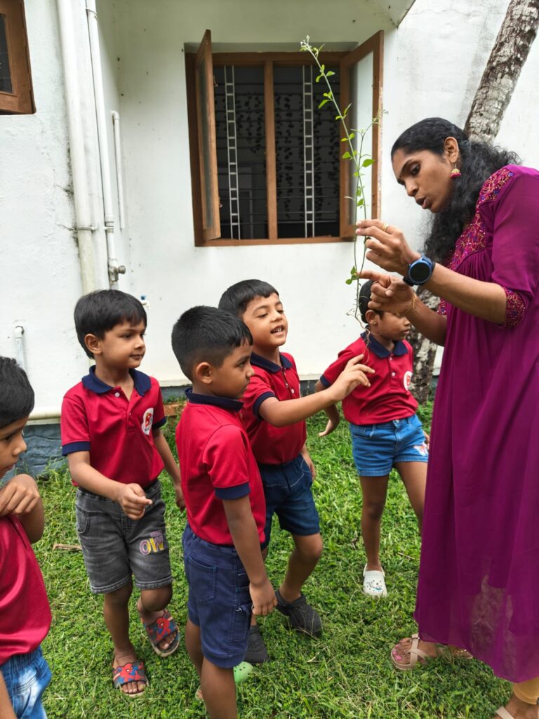 Plant Parts – The teacher guides the children outside to explore a real plant, helping them identify parts like the root, stem, leaves, flower, and fruit through direct observation.