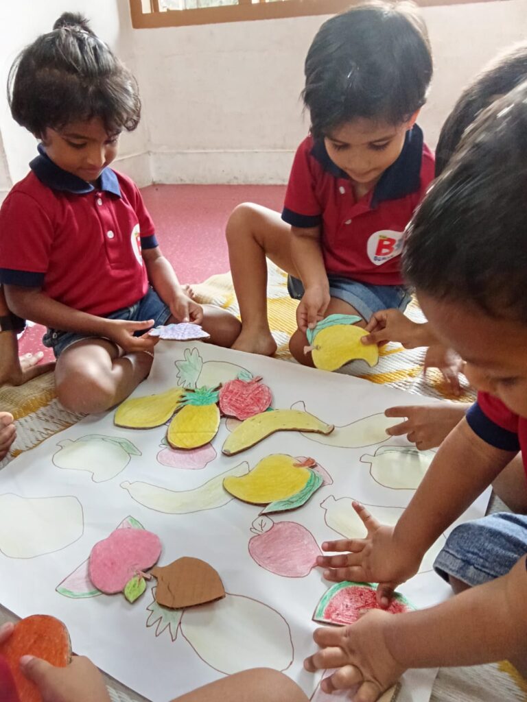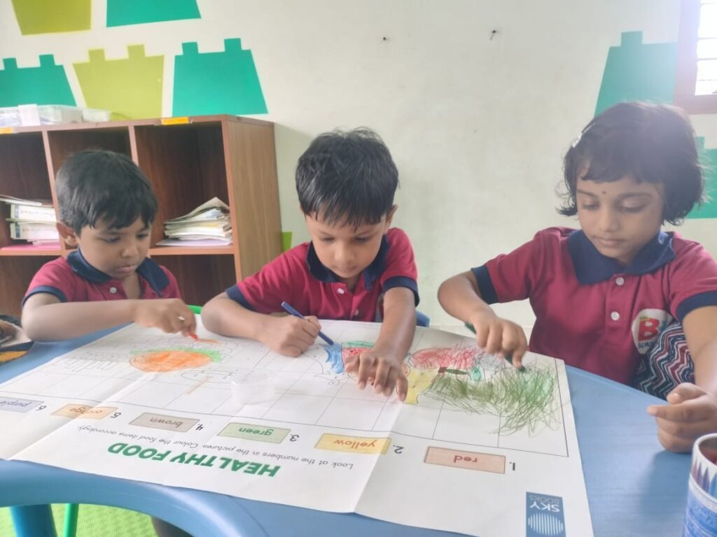 Healthy Food – Children actively engaged in colouring their healthy food chart. From BB CLE Kit