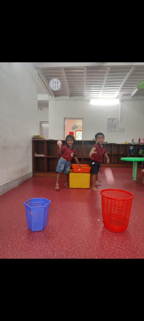 Throwing the ball into the basket Children will toss a ball into a basket placed at a short distance. They will take turns aiming and throwing while enjoying the activity.