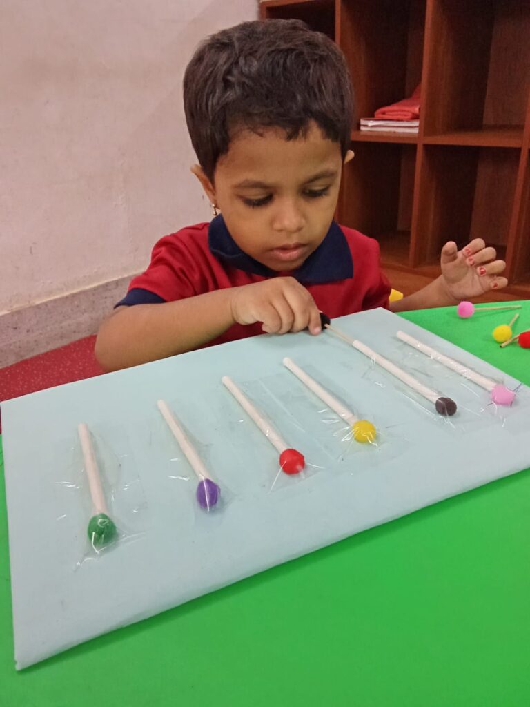 ✨ “A fun fine-motor activity where the child matches colorful pom-poms to sticks 🎨👶. This hands-on task boosts focus, coordination, and color recognition for playgroup 🌈🧠.”k