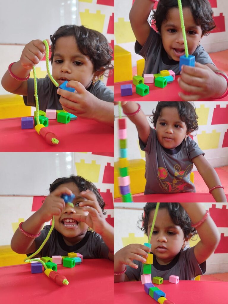 Children enjoyed the bead threading activity 😊🧵, improving fine motor skills, focus, and hand–eye coordination. They explored colours, counted beads, and created patterns with joy 🎨✨.