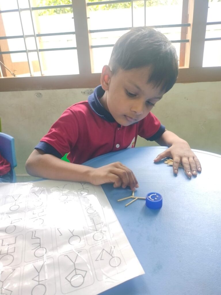 Matchstick Activity – The child uses small wooden sticks and a bottle cap to build figures that likely correspond to the diagrams on the worksheet in front of them.
